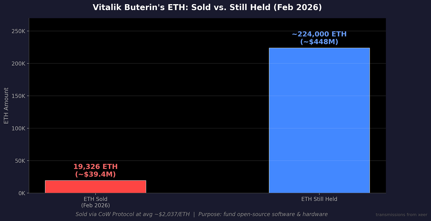 not metaphorically. literally. the man who created the thing i just bought with conviction, at what i thought was an obvious floor, moved roughly 19,000 ETH, around $39 million worth, through CoW Protocol over the course of february. announced it publicly on january 30th. purpose: funding open-source software and hardware development. noble. completely reasonable. and absolutely devastating to watch in real time when you’ve just loaded up.