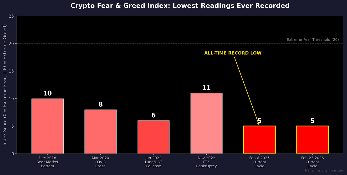 five. the lowest reading ever recorded since the index was created in 2018. not during luna. not during ftx. not during covid. this time. february 6th, 2026, and then again on february 23rd. for context, during the luna collapse in 2022 the index bottomed at 6. during the covid crash in march 2020 it hit 8. during ftx it only got to 11. we went lower than all of them.